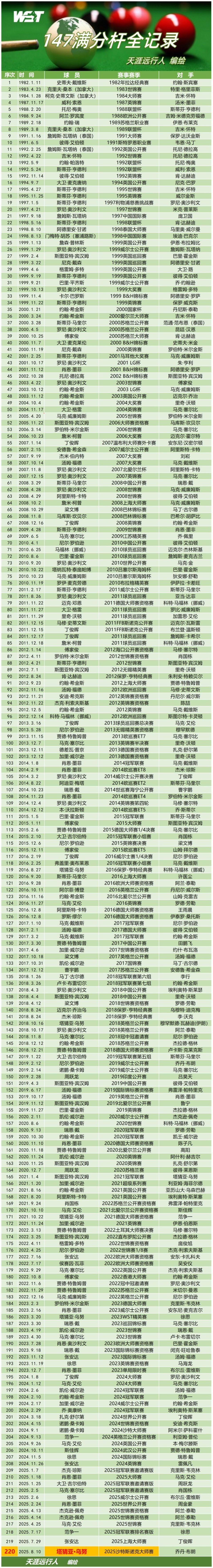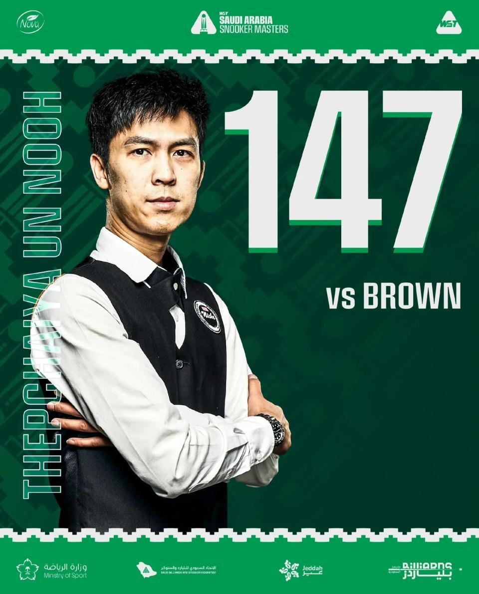 第五杆,2025.8.10 沙特斯诺克大师赛,背景板乔丹·布朗,若本届赛会无人再打出147,独享满分杆奖50000镑,没有单杆最高分奖。