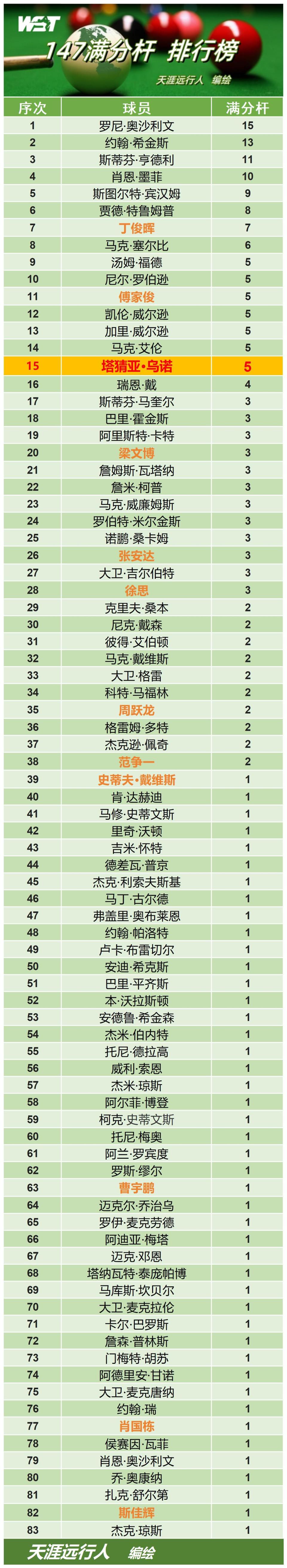 跟去年的首届一样,沙特阿拉伯斯诺克大师赛,依然没有设立单杆最高分奖,但打出147满分杆有5万英镑的奖金,若此后没有球员打出147,塔猜亚将独揽这近50万块的大奖。当然本赛季,在斯诺克四大赛打出两杆147的球员,将获得WST官方14.7万英镑的额外奖励,已经占得先机的塔猜亚拥有大把大把的机会,去冲击这一奖项,即使在本届沙特大师赛上完成,一点也不令人惊讶,年初的世锦赛资格赛上,杰克逊·佩奇不就一场飚出两杆吗,等着看吧,好戏在后头。
